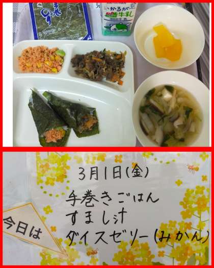 本日の給食は ・手巻きご飯(牛肉のコチジャンいため)