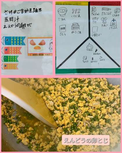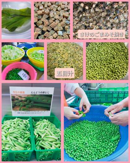 本日の給食では、「さや」ごと納品された『えんどう』から、豆を取り出し、卵をとじて調理しています。