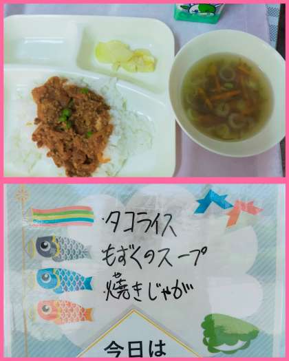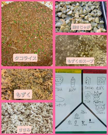 旨みを増したもずくスープに、沖縄料理のひとつ「タコライス」、パリッとホクホクした「焼きじゃが」をおいしくいただきました.