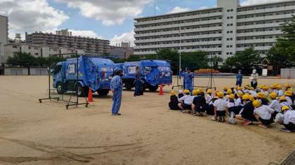 大阪市環境局の方々にお越しいただき、パッカー車体験をしました。