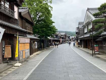 伊勢神宮の旧参宮街道のおはらい町通りとおかげ横丁で買い物タイムです。傘を出さずに過ごせています。