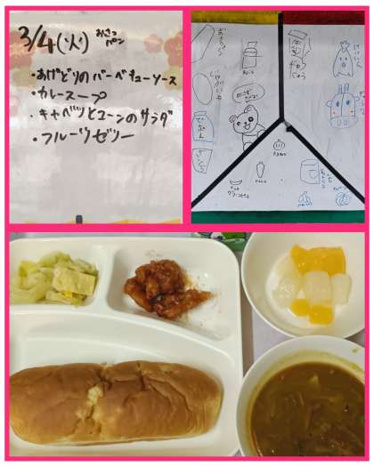 いつもの食器に、一品多く小椀が付き、豪華な献立をいただきました。児童からは、『鶏肉のバーベキューソースは、ヤンニョムチキンと同じ味だ!』『もう一度卒業祝い献立が食べたい!』と喜びの声などが聞こえてきました。