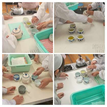 5年生になり家庭科の授業が始まっています。家庭科での最初の調理実習となるお茶の入れ方を学習しました。人数分の水を計量し、湯を沸かし、同じ濃さになるようにまわし注ぎをしました。
