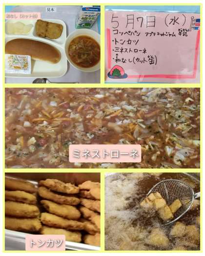 今日の給食の具材は、鶏肉とキャベツ、たまねぎ、にんじん、トマト、パセリなどが使われています。