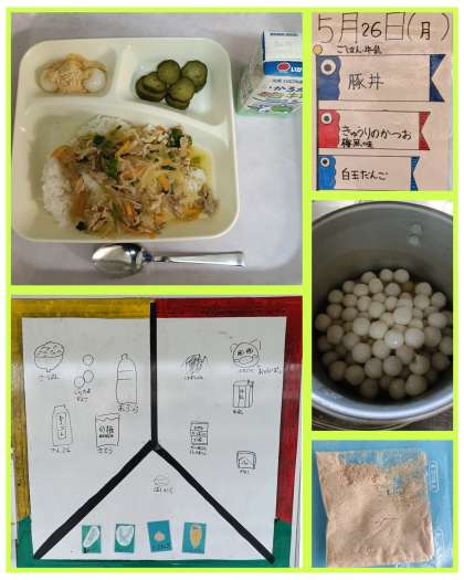 今日の給食では、冷凍の白玉だんごを焼き物機で蒸して、砂糖・うすくちしょうゆ・でん粉で作ったあんをからめて、自分達で、きな粉をかけていただきました。