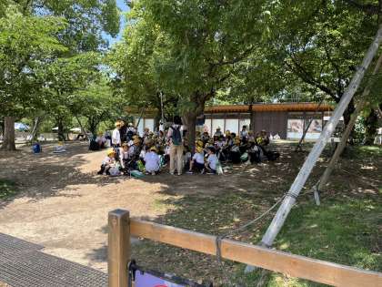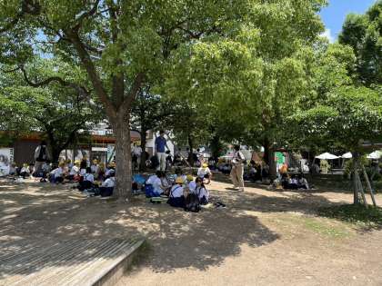 てんしばで食事中です。暑いですが、風があり、日陰は過ごしやすいです。