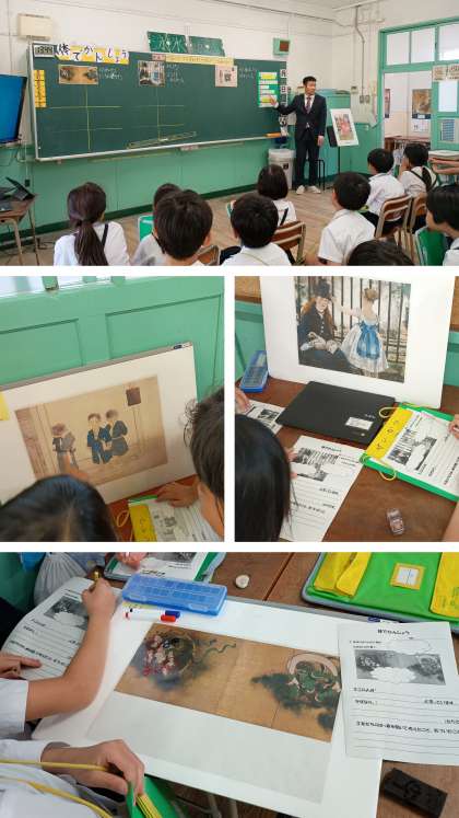 3年2組の教室で、1回目の研究授業が行われました。今年度から教科は図画工作科です。作品を鑑賞して、子どもたちの柔らかい頭からは、たくさんの感じ方や見方が出てきました。