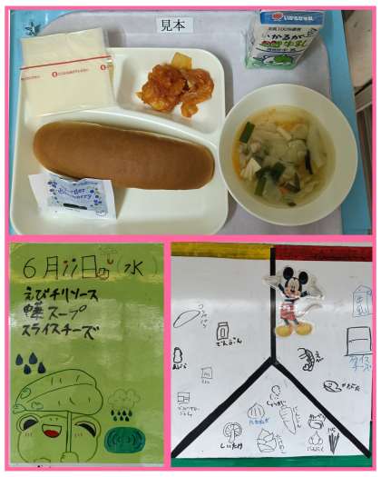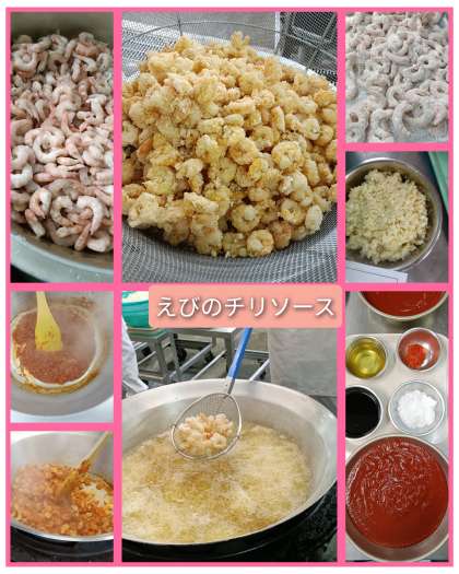 給食の『えびのチリソース』は塩、こしょう、料理酒で下味をつけたえびを片栗粉でまぶして油であげます。しょうが、にんにく、豆板醤を香り良くいためてたまねぎを炒め、砂糖、濃口醤油、ケチャップで味つけした少し辛みのきいたソースをからませます。