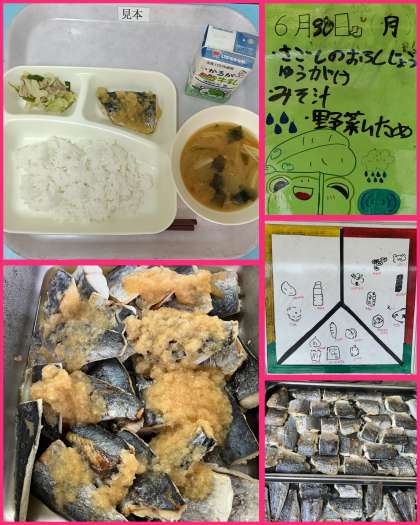 焼き物機で焼いたさごしにだいこんおろし、みりん、うすくちしょうゆで作ったタレをかけています。