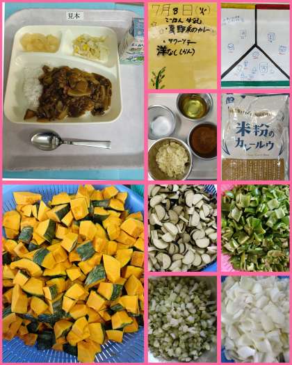 『夏野菜のカレーライス』は、にんにく、セロリと牛肉を炒め、夏野菜には、大きめに切ったかぼちゃや、なす、ピーマンが使用されて、トマト(缶)も入っています。