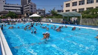 キッズチームごとに6年生と1年生が組になって活動しました。一緒に水に慣れる活動をしたり、水の中をジャンプで進んだり。