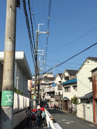 雲ひとつない秋晴れの中、全校児童が遠足で服部緑地公園へ向けて出発しました。