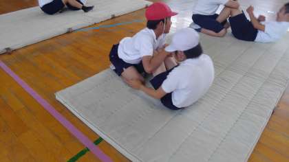 ひざを友だちにおさえてもらって、30秒間、できるだけ多く上体を起こします。