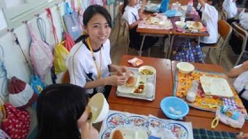 すぐに子どもたちと親しくなり、給食も和気あいあいとした雰囲気で食べていました。