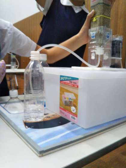 沈殿地などを見学した後、四国地方の川の砂を使って、汚れた水をきれいにする実験をしました。子どもたちは、「わぁ、きれいになった。」と喜びの声を上げていました。