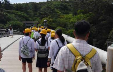 50分ほどバスに乗って、伊勢神宮に着きました。広々とした境内には、すでに多くの参拝者がおられましました。