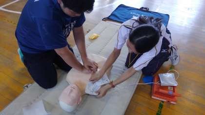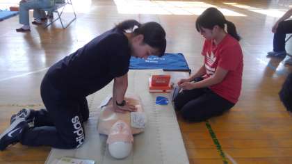 救急車を呼ぶのはもちろんですが、尊い命を救うため、そして、その方の社会復帰の可能性を高めるためにも、救命処置を行うことができるよう、全教職員で、胸部圧迫と人工呼吸、AEDを使った救命救急の研修を行いました。