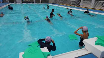 水慣れをしたあと、早速、平泳ぎの足や手の動きを教えていただきました。さすがにポイントをおさえた指導で、ビート板をラッコのように抱えながら、うまく足の裏で水を蹴っているかを確かめます。教えていただいた通りできるようがんばっていました。