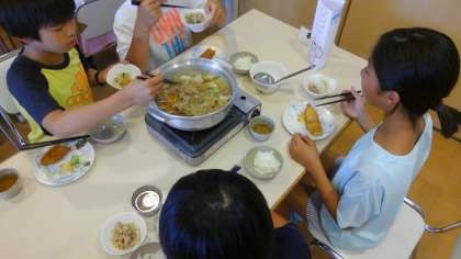 夕食はお楽しみのカモ鍋です。グループのメンバーの分を取り分けたり、お茶を注ぎあったり、みんなで協力しながら、楽しくいただきました。