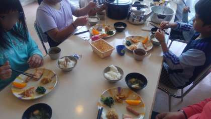 朝のつどいの後は、山登りに向けて、朝御飯をみんなもりもりと食べていました。
