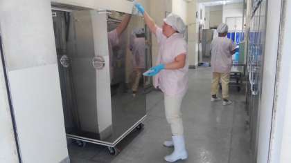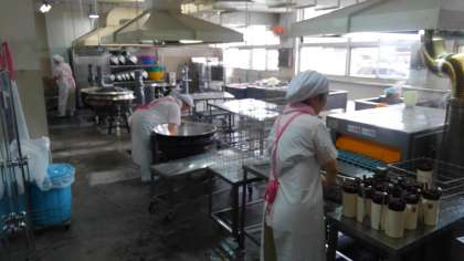 給食室では、準備に大忙しです。大きな釜や食器など、全てのものをきれいに洗ったり数を確認したりして、2学期も、皆が安全に安心して給食を食べられるようにしています。