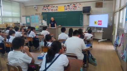 本校では、毎週月・火・木曜日の週3回、5時間目が始まる前の時間(「東淡路の時間」)を活用して、1年生からの英語教育(英語タイム)に取り組んでいます。