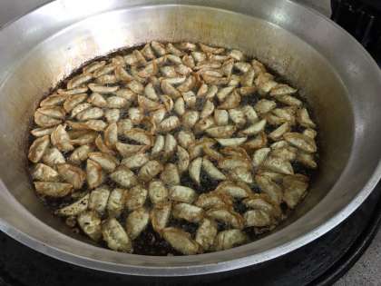 大きなお釜で、一気にぎょうざを揚げます。これで75人分です。