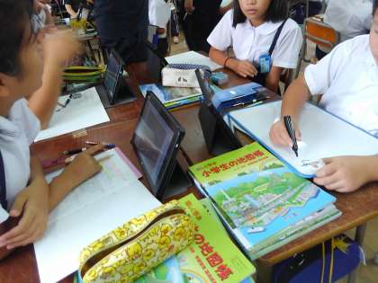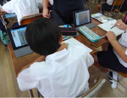 1組での授業同様、子どもたちは、タブレットに提示された資料を見て、わかったことをどんどんノートに書き出していました。