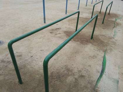 一輪車の練習にはかかせない、運動場にある手すりを、管理作業員さんが、左の写真のように、こんなにきれいに修繕してくださいました。