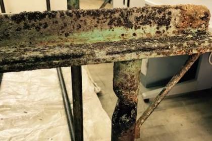地面にうまっていた部分は、右の写真のようにサビだらけで穴まで開いています。