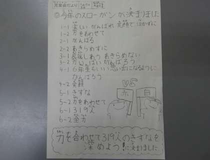 各クラスで、運動会に向けたスローガンを話し合い、それらをもとに、児童会全体でスローガンを決めました。