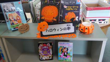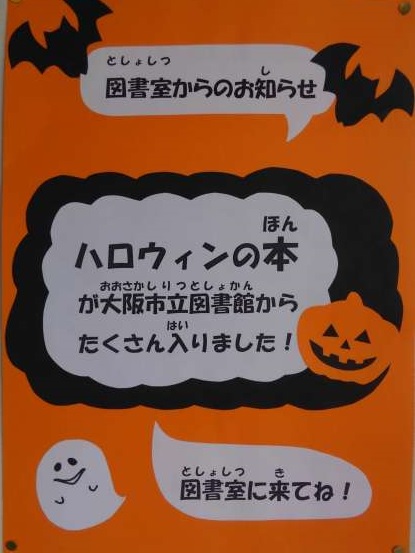 ということで、図書館補助員の先生が、図書館入り口にかわいいディスプレイをしてくださいました。また、市立図書館からも、ハロウィンの本をたくさん貸していただいて、学校の図書館が、とてもにぎやかになっています。