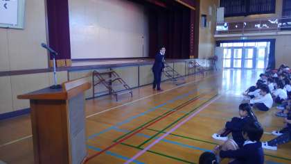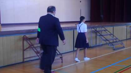 6年生が代表で、不審な人に声をかけられたときのロールプレイをしてくれました。