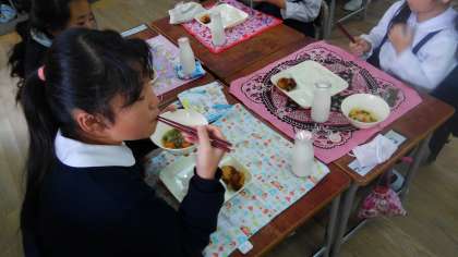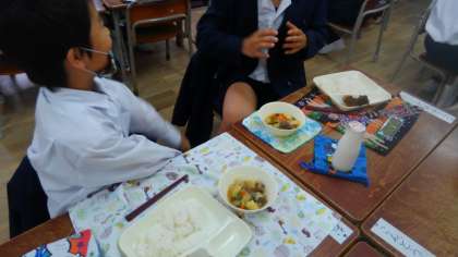 味噌カツとじゃがいもと野菜の煮物などの給食を、美味しく楽しく食べていました。