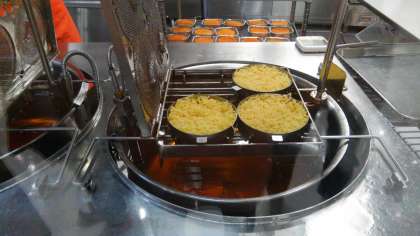 麺をこねるところからスタートです。製麺器でのばして、麺の形にしたら、蒸して、味をつけます。後は型にいれて、写真のような高温の油の入った鍋に、入れて2分。出来上がりです。
