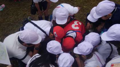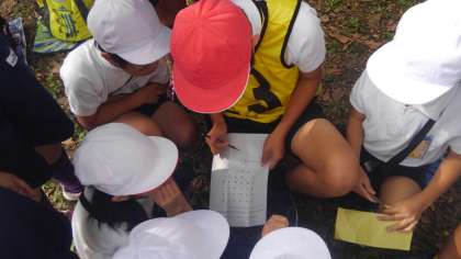 スタート地点で、キッズチームごとに、文字を並べかえて言葉を見つける問題に挑戦です。