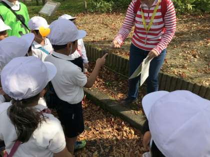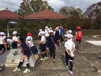 ポイント5は「太陽の塔はどこかな?」。太陽の塔は、東・西・南・北、どちらの方向にあるかを答えます。万博記念公園の地図と、方角がかかれた石をヒントに、高学年ががんばって探していました。