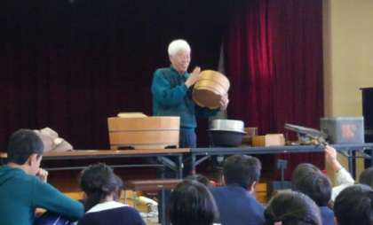 「どうして炊いたご飯を、おひつに入れるとおいしくなるのでしょうか?」と粕谷先生。「木の香りがつくから?」子どもたちなりにいろいろ考えて答えていました。