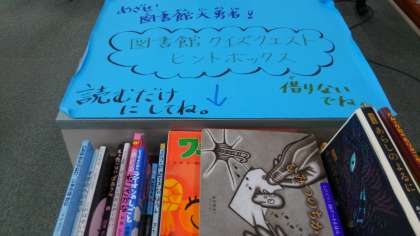 本に関するクイズが、校内の50ヵ所に掲示されているのを見つけて番号で答えます。全問解いて、図書委員に解答用紙を渡してミッション・コンプリート!