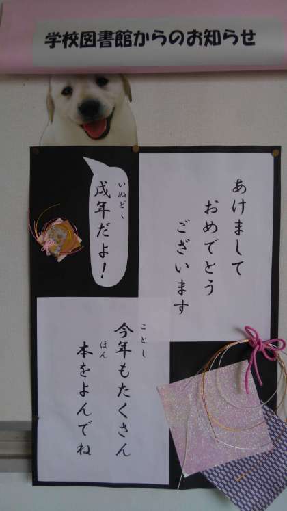 学校図書館のお知らせも、新年らしい掲示になりました。