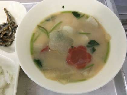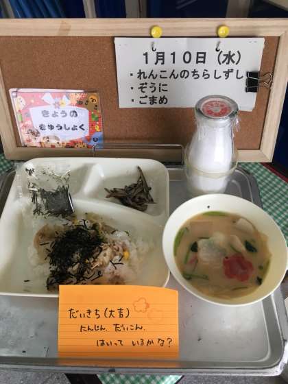 3学期初めての給食に、お雑煮とれんこんのちらし寿司、ごまめが出ました。