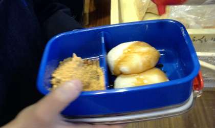 つきたてのお餅は、すぐに丸めてもらい、きなこや醤油につけて、教室でいただきました。