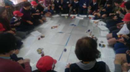 コマまわしの部屋では、地域活動協議会の会長さんなどが、ひもの巻き付け方やコマの飛ばし方など、手取り足取り教えてくださいました。「おっちゃん、見とってな。」と得意気にコマをまわす児童に「おお、うまいうまい!」と応じて下さっていました。