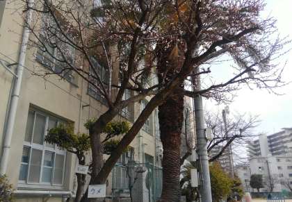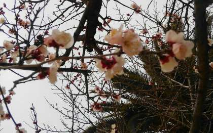 校舎南側の池のほとりにある梅が、このところの暖かさに誘われて、きれいに咲き始めました。