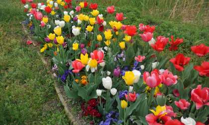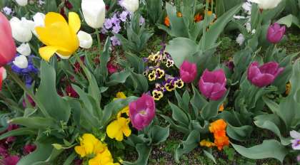 本校の特色でもあるネイチャーランド。地域のグリーンボランティアの方々がお世話して下さっていたチューリップやすみれの花が、とてもきれいに咲いています。