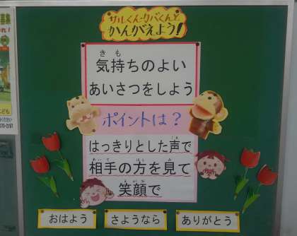 また、「おはようございます」だけではなく、「ありがとう」や「こんにちは」などのあいさつもあること、「こんにちは」は、学校に来られたお客さまに出会ったときに言うことなどを、みんなで確認しました。