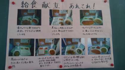 どんな給食を食べているのか、気になっている保護者もおられるかもしれないと、給食調理員さんが、給食初日から昨日までの給食献立の写真を撮り、どんな食材をどんな風に調理したのかをまとめて、教室に掲示してくれました。