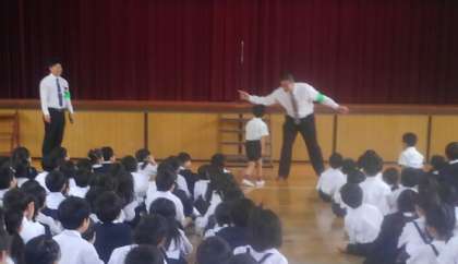 2年生の二人が、不審者に扮した警察の方に向かって、逃げたり大きな声を出したりして、上手に対応していました。