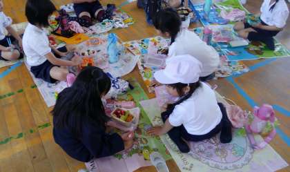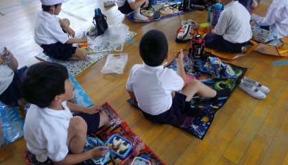 シートを敷いて座り、好きなおかずを見せ合ったり、おしゃべりをしたりしながら、楽しく食べていました。