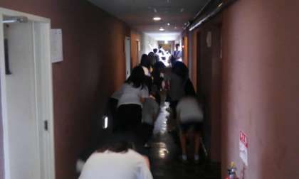 外で朝の集いが出来ないので、部屋の廊下で、少し体を動かし目を覚まします。